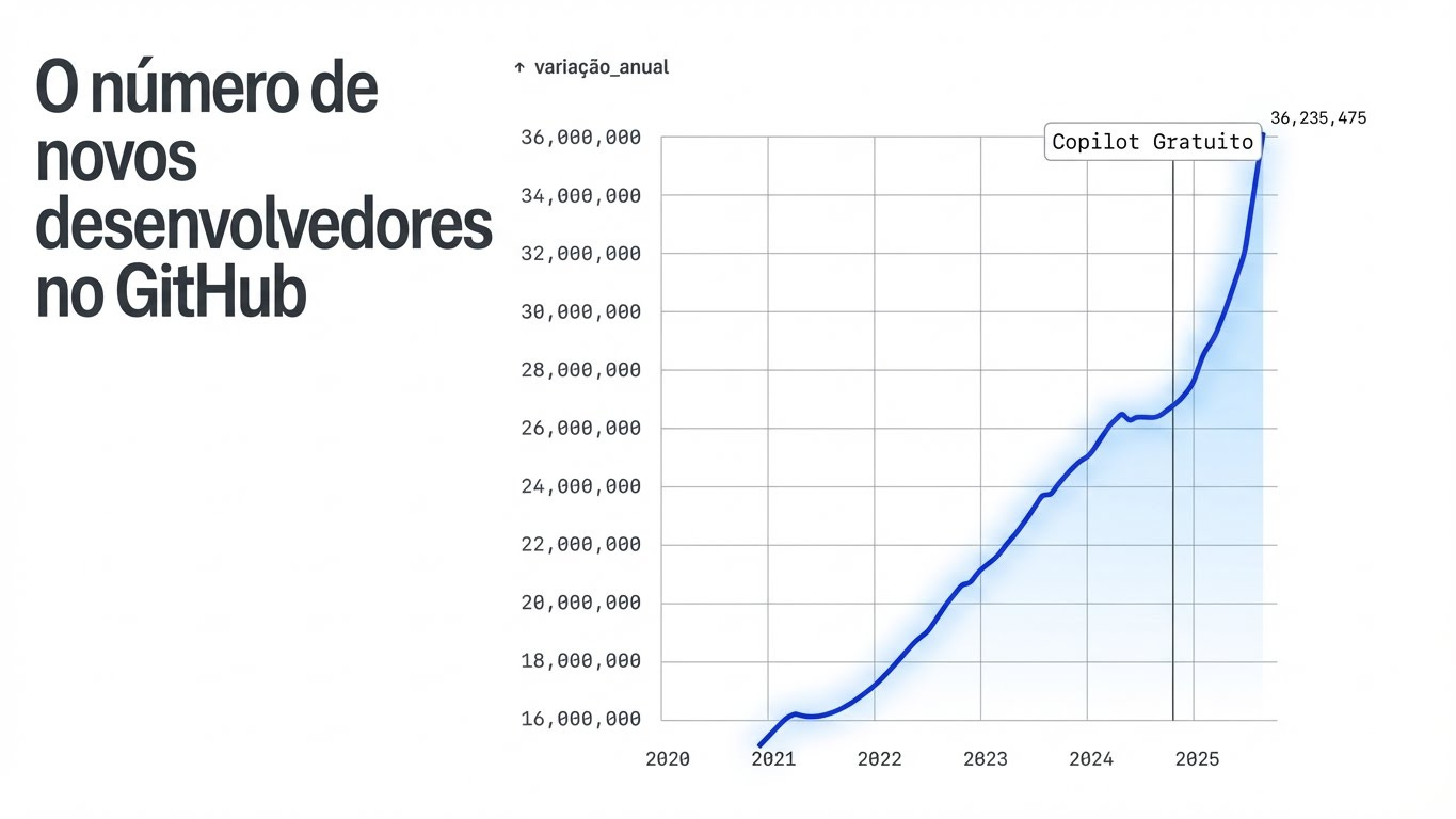 O número de Programadores Ativos no GitHub cresceu de forma acelerada desde Abril de 2024, reflexo das ferramentas de Vibe Coding como: Lovable e Emergent. Também incluindo o Copilot Gratuito do próprio GitHub.